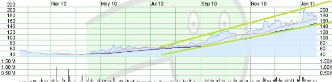 Momentan liegt der Kurs in Australien exakt auf der 30-Tages-Linie und damit auf seinem ersten Widerstand. Sollte dieser nicht halten, ist ein weiteres Abgleiten des Kurses bis auf ca. 1.60 AUD möglich, wo die 60-Tages-Linie verläuft. Ein Hinweis auf einen weiteren, kurzfristigen Rücksetzer auf dieses Niveau könnte die Kurshistorie der letzten Nacht sein: Dort sind nämlich seltsame Trades enthalten, die als eine Art „geheimer Code“ unter Tradern interpretiert werden könnten, den Kurs bis auf 1.601 AUD fallen zu lassen Siehe Auszug aus ASX Course of Sales BOC 21.01.2011 :