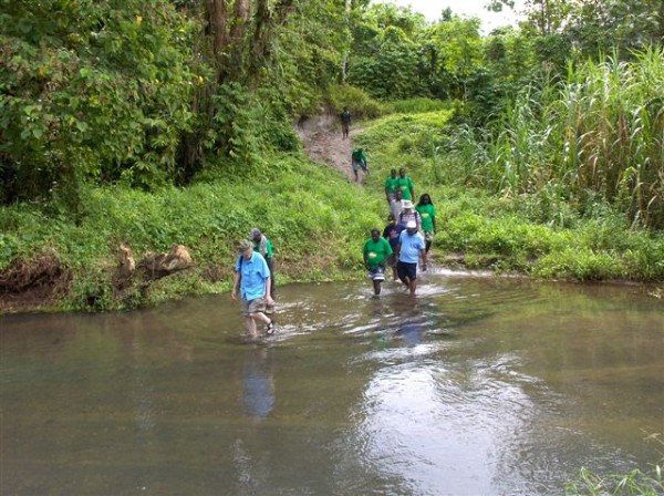Members of first assessment team being guided around Torokina by local residents