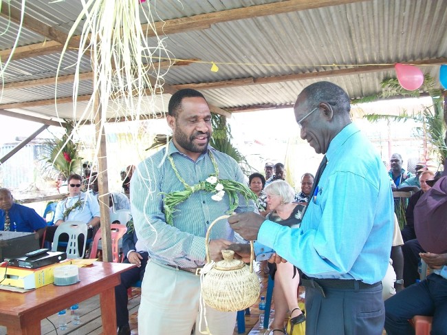 Communications Minister in the ABG Carolus Ketsimur (right) presents gift to the Governor of Western Highlands Tom Ogla (left) at the Buka market opening.