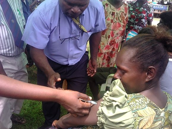 Pictured is a mother being immunized as part of the SIA launching on Buka today.