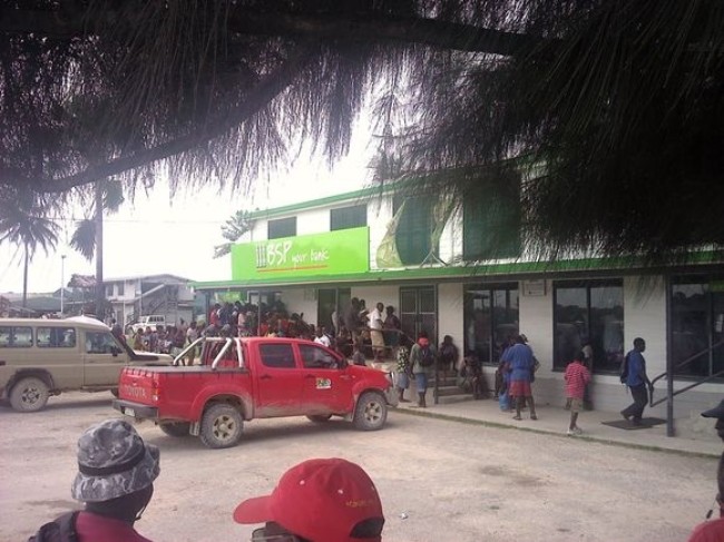 Pictured are customers outside the only bank BSP BUKA