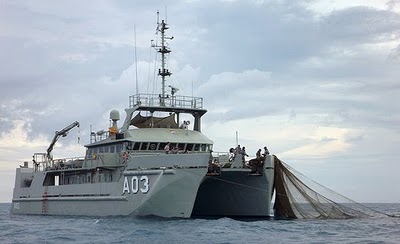 The Royal Australian Navy ships HMAS BENALLA (pictured above) and HMAS SHEPPARTON (pictured below) arrived in Torokina today (28 February). They will sail up and down the coast line to chart the depths of the water, mark any underwater obstructions and determine suitable anchorage points for ships involved in Operation Render Safe. This will enable safe navigation for ships involved in Operation Render Safe. Survey operations are scheduled to cease on 27 April.