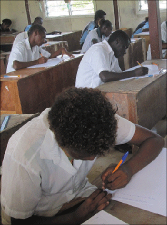 Pictured are some of the students of Hahela Primary School in Buka busy doing their examination. The other students that are wearing the blue uniforms are from Kamarau International School.