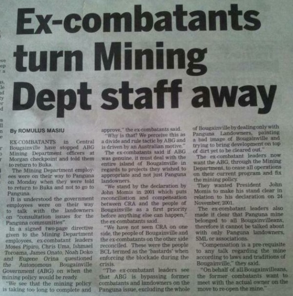 So, without the entire valley being told, in late 2000 Boniface Arunara began sampling for the mineral. He had previously been an avid Panguna panner but, after being wounded in the left leg by the Papua New Guinea military, could not walk the long trails.