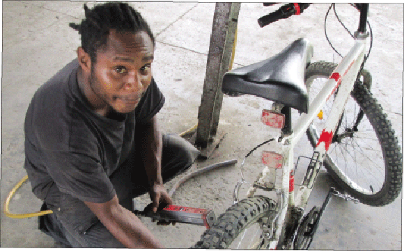 CASEY Dickson is an employee of Arawa Tyre Service (ATS) specializing in tube or tyre repair and other job on hand regarding tyre services. Young Cassey from Koromira is one of the many students on practical at ATS. ATS is also giving opportunity to other youngsters who are doing nothing back at home by employing them and keeping them out of drug and home brew consumption. Cassey is pictured giving air to a bicycle tyre tube in yesterday. Words and Picture: ROMULUS MASIU